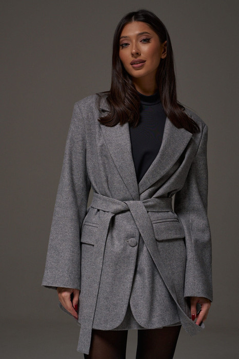 Жакет прямого свободного кроя. Выполнен из шерстяной (смесовой) ткани серого цвета. Характеристика: подкладка, воротник отложной с лацканами, рукав втачной и чуть спущен, по переду карманы с клапанами, застёжка центральная - пуговицы, в среднем шве заднего полотна шлица (29,5 см). В комплекте пояс из ткани основного изделия. Длина спинки 78 см. Длина рукава от линии втачивания 62 см