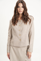 Жакет прямого свободного кроя. Выполнено из пальтовой ворсовой ткани нежного розового цвета. Характеристика: брендтрованная подкладка, воротник отложной с лацканами, рукав втачной и чуть спущен, по переду карманы с клапанами, застёжка центральная - пуговицы, в среднем шве заднего полотна шлица (29,5 см). В комплекте пояс из ткани основного изделия. В комплекте идет пояс из основной ткани изделия. Длина спинки 78 см. Длина рукава от линии втачивания 62 см