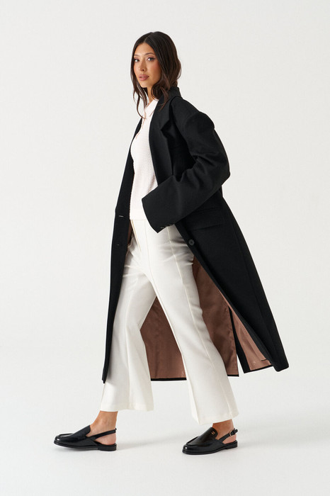 Жакет прямого свободного кроя, выполнен из костюмной ткани черного цвета. Характеристика: V-образный вырез горловины, отложной воротник, застежка центральная на две петли пуговицы, функциональные карманы с клапанами, брендированная подкладка, широкое плечо, подплечники, рукав втачной, на манжете функциональные пуговицы, в среднем шве заднего полотна изделия шлица 51 см. Длина изделия по центральному щву по спине 118 см, длина рукава от края горловины 84 см.