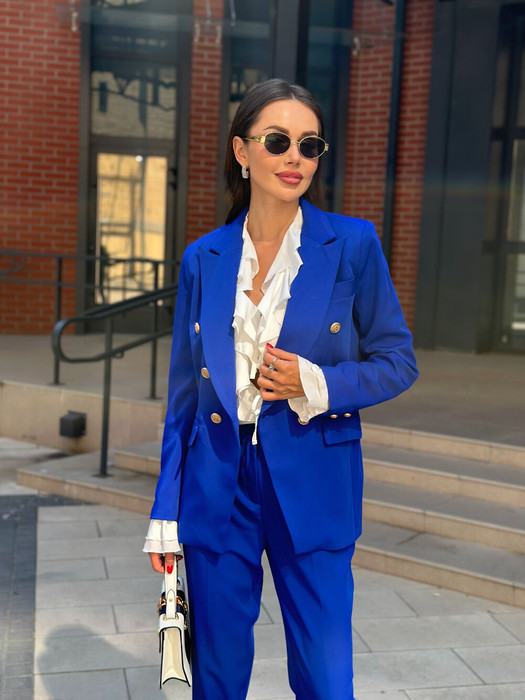 Двубортный жакет на подкладке, прямого силуэта. Обработаны прорезные карманы по переду. Рукава втачные одношовные, обработаны шлицей