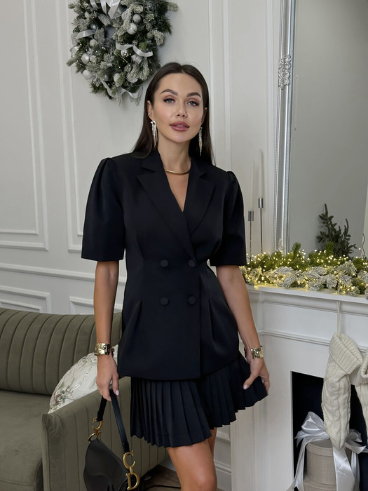 Жакет 2-бортный, на подкладке. Рукав короткий, втачной, одношовный, по окату собран складками дляя увеления объёма. Обработаны талиевые вытачки по переду и спинке изделия