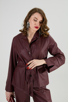 Рубашка из плотной джинсовой ткани, удинённая. Лния плеча спущена, рукав одношовный, обработан манжетой из основной ткани.Воротник рубашечного типа. По талии обработана кулиса и шнурок из основной ткани. Застёгивается на пуговицы.