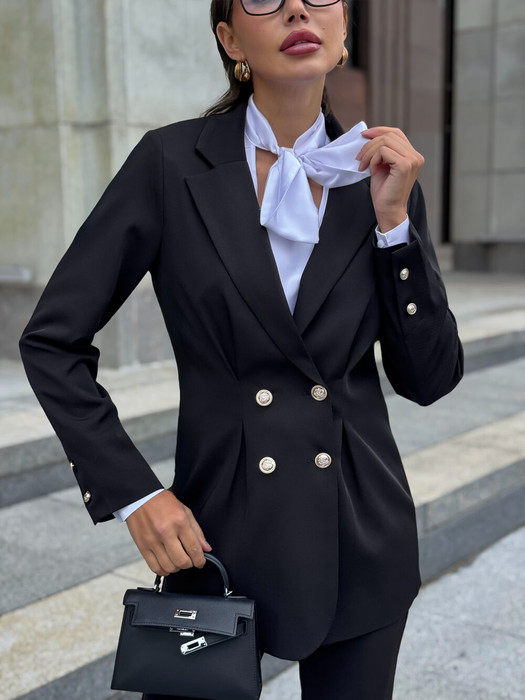 Жакет однобортный, на подкладке, обработаны защипы на линии талии. Воротник костюмный, рукав втачной, прямой, лдношовный, обаботан шлицей. Фурнитура - пуговицы золотистого цвета