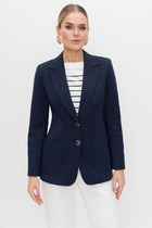 Жакет женский удлиненный, полуприлегающего силуэта с центральной бортовой застежкой на пуговицы до линии перегиба лацкана. Спереди рельефные швы от плечевого шва, отрезной бочок и карман с клапаном. Спинка с рельефами от плечевого шва. Рукав втачной, двухшовный. Воротник пиджачного типа. Жакет на подкладке. Длина рукава 62 см, длина по спинке 70см.