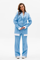 Жакет женский удлиненный, из текстильной ткани, на подкладке, полуприлегающего силуэта с центральной бортовой застежкой на пуговицы до линии перегиба лацкана. Спереди рельефные швы от плечевого шва, отрезной бочок и карман с клапаном. Спинка с рельефами от плечевого шва. Рукав втачной, двухшовный. Воротник пиджачного типа. Длина по спинке 67 см, длина рукава 62 см.