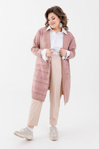 Жакет двубортный, свободного кроя, на подкладке. По переду имеется отрезной бочок и вертикальные вытачки. С прорезными карманами с клапаном и двумя обтачками. Спинка со средним швом. Воротник пиджачного типа. Рукав двухшовный, втачной. Длина рукава 63 см, длина по спинке 74 см.