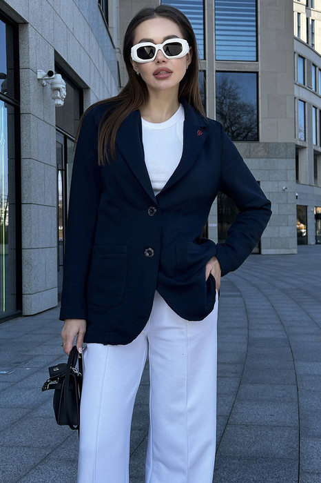На левом лацкане вышивка-логотип в контрастном цвете. Низ и борта имеют открытые края (эффект необработанного шва), укреплены дополнительной строчкой. Жакет без подкладки.
