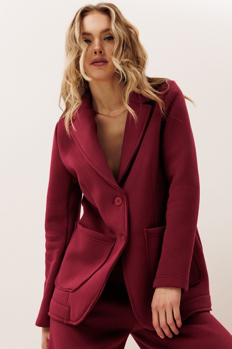 Жакет в стиле smart casual. Жакет прямого силуэта с пиджачным воротником, имеет удобные накладные карманы и застежку на 2 пуговицы. На левом лацкане вышивка-логотип в цвет ткани. Низ и борта имеют открытые края (эффект необработанного шва), укреплены дополнительной строчкой. Жакет без подкладки.