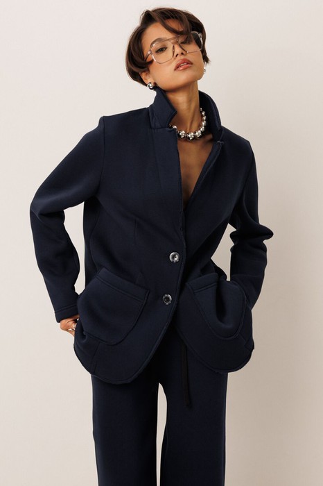 Жакет в  стиле smart casual. Жакет прямого силуэта с пиджачным воротником, имеет удобные накладные карманы и застежку на 2 пуговицы. На левом лацкане вышивка-логотип в цвет ткани. Низ и борта имеют открытые края (эффект необработанного шва), укреплены дополнительной строчкой. Жакет без подкладки.