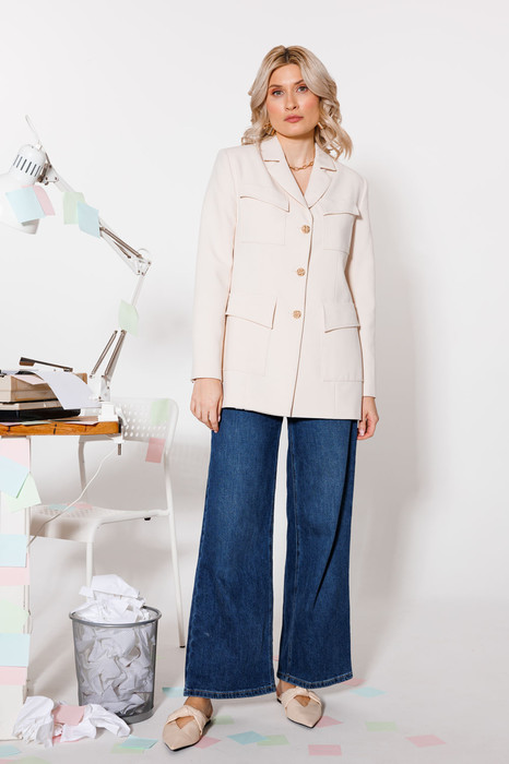 Жакет в стиле милитари – это изысканность и лаконичность в одном флаконе. Жакет приталенного силуэта с обрисованной талией. По переду расположены карманы с клапаном. Застежка центральная на дизайнерские золотые пуговицы. Сзади в среднем шве спинки расположена высокая шлица. По низу рукава, так же расположена шлица с пуговицей. Если вы хотите выглядеть роскошно – этот жакет для вас. Длина изделия – 70 см