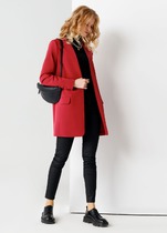 Жакет однобортный умеренного объема, приталенного силуэта. Силуэт изделия создается за счет отрезных бочков на спинке и полочке, а также за счет среднего шва и плечевых вытачек на спинке. На полочке нагрудная вытачка переведена в плечевой шов. Плечевой пояс расширен и поддерживается плечевыми накладками. Рукав втачной, длинный, двухшовный. Воротник отложной с отрезной стойкой, пиджачного типа. Застежка на уровне линии талии на одну петлю и пуговицу. Жакет полностью обработан притачной подкладкой. Длина изделия до середины бедер.