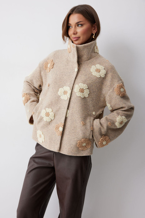 Жакет прямого силуэта из букле на трикотажной основе. Воротник-стойка. Центральная застежка на крючки. Рукав со спущенной линией плеча. По переду прорезные карманы. Жакет на подкладке. Обращаем ваше внимание, что фурнитура может отличаться от фото.