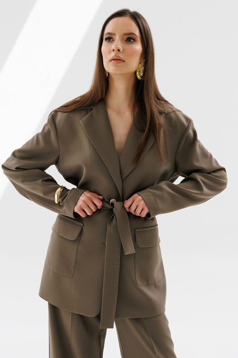 Жакет прямого силуэта со съемным поясом из основной ткани. Нагрудная вытачка переведена в плечевой шов. На полочке изделия накладные карманы с клапанами и шлевки для пояса. На спинке изделия плечевые вытачки и шлевка для пояса. Воротник пиджачного типа с лацканами. Рукав втачной двухшовный. Застежка центральная на петли и пуговицы.