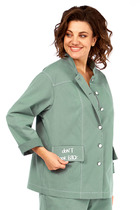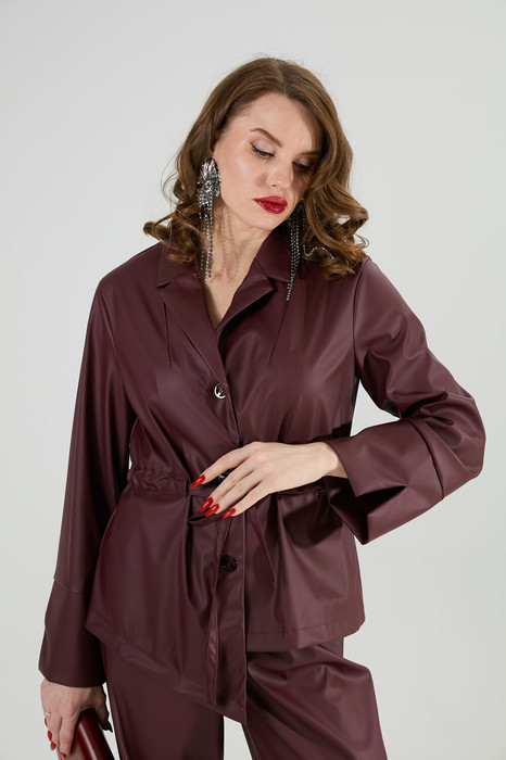 Жакет прямого силуэта, воротник пиджачного типа, рукав одношовный, втачной с незначительно спущенной линией плеча, длинный, с притачной манжетой, декорированной разрезом. По линии ткани настрачная кулиса с завязками из основной ткани. Застежка центрально-бортовая. Линия низа верхней части фигурная ассиметричная.