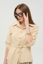 Жакет прямого силуэта, воротник пиджачного типа, рукав одношовный, втачной с незначительно спущенной линией плеча, длиной три четверти, с патой. По линии ткани настрачная кулиса с завязками из основной ткани. Застежка центрально-бортовая. Линия низа верхней части фигурная ассиметричная.