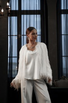 Жакет прямого силуэта с имитацией центральной застёжки на пуговицы. Рукав втачной одношовный, длиной три четверти,застегивающийся на пату. Воротник пиджачного типа . Линия низа фигурная, симметричная . По левому переду расположена декоративная деталь.