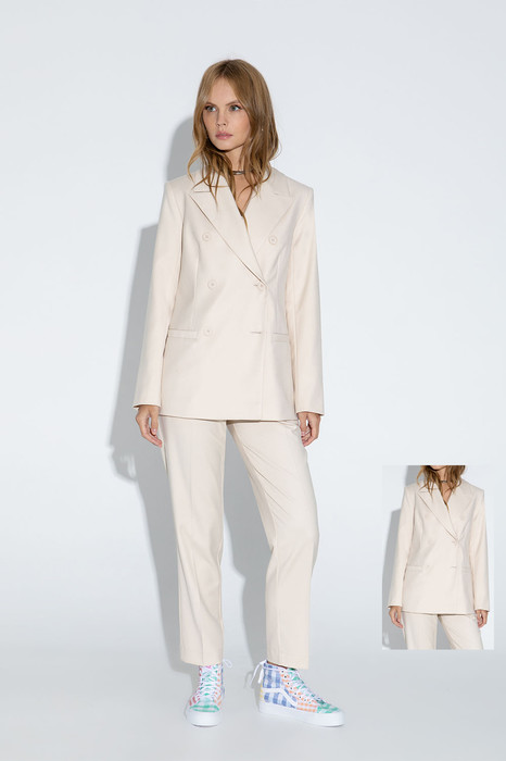 Текстильный классический жакет прямого кроя. Детали: жакет полуприлегающего силуэта, пиджачный воротник, перед с прорезными карманами, двубортная застежка на петли и пуговицы, спинка со средним швом, рукава втачные двухшовные, жакет на подкладке