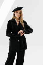 Детали: пиджачный воротник, талиевые вытачки, функциональные карманы, застежка на петли и пуговицы, спинка со средним швом и шлицей, рукава втачные двухшовные со шлицами по низу, жакет на подкладке.