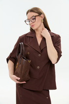Детали: жакет прямого силуэта, расширенная линия плеч, пиджачный воротник, перед с функциональными карманами, однобортная застежка на петли и пуговицы, спинка со средним швом и шлицей, рукава втачные двухшовные, жакет на подкладке