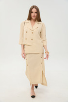Детали: полуприлегающий силуэт с расширенными плечами, цельнокроеный воротник-стойка, застежка на петли и пуговицы, рукава втачные двушхшовные, жакет на подкладке