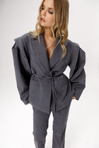 Детали: жакет приталенного силуэта, расширенная линия плеч, пиджачный воротник, рукава фигурной формы с верхним швом, спинка со шнуровкой и застежка на две пуговицы, с помощью которых можно регулировать прилегание по талии, на подкладке.