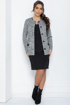 Модель прямого силуэта, на подкладе, с двубортной застёжкой на петли и пуговицы. Спереди прорезные карманы в рамку с клапаном. Средний шов спинки снизу заканчивается шлицей. Воротник пиджачный. По низу рукава отлетная шлица с декоративными петлями и пуговицами.