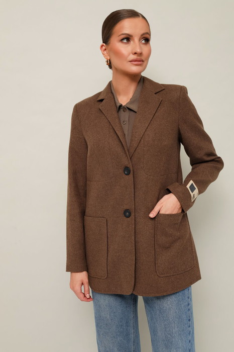 Стильный жакет полуприлегающего силуэта, выполнен из полушерсти. Воротник пиджачного типа с отложными лацканами. Застежка центральная на петли и пуговицы. Спереди обработаны накладные карманы, в области груди подрезы с нагрудными вытачками. Спинка с рельефами и средним швом, переходящим в шлицу. Рукава втачные двухшовные, на левом рукаве декоративная нашивка. Изделие на подкладке.