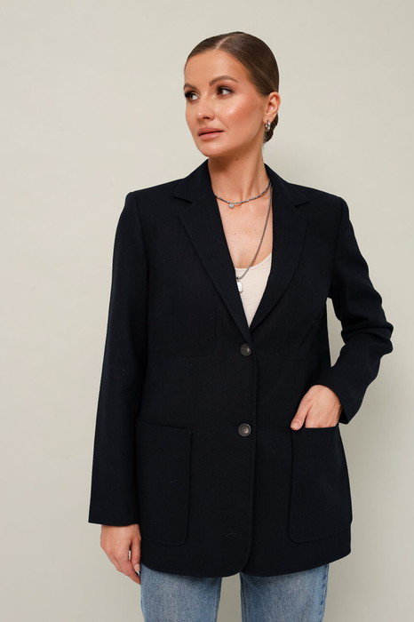 Стильный жакет полуприлегающего силуэта, выполнен из полушерсти. Воротник пиджачного типа с отложными лацканами. Застежка центральная на петли и пуговицы. Спереди обработаны накладные карманы, в области груди подрезы с нагрудными вытачками. Спинка с рельефами и средним швом, переходящим в шлицу. Рукава втачные двухшовные, на левом рукаве декоративная нашивка. Изделие на подкладке.