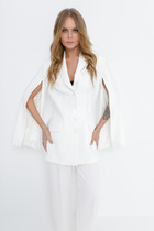 Силуэтный жакет с подчеркнутой линией талии, выполнен из жаккарда. Смещенная застежка на петлю и обтяжную пуговицу. Воротник пиджачного типа с отложными лацканами, край борта скругленный по низу жакета. Спереди обработаны прорезные карманы в рамку с клапанами и нагрудный прорезной карман с листочкой. Рукава втачные, двухшовные с отлетнымм шлицами. Спинка с рельефами и средним швом, переходящим в шлицу. Жакет на подкладке.
