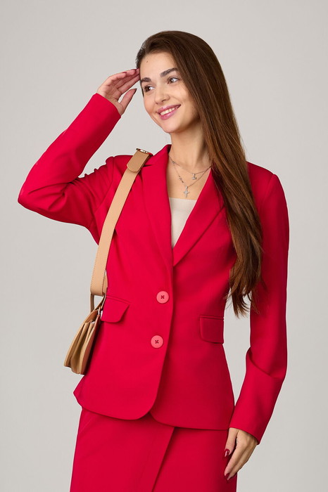 Жакет на подкладке приталенного силуэта с прорезными карманами с клапанами по переду. Воротник-английский. Рукава-двухшовные. Застегивается на две пуговицы. Серебристый кант по борту, клапанам.