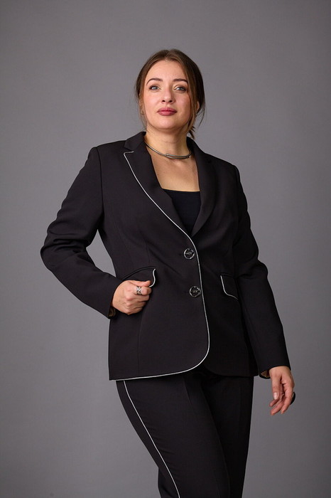 Жакет приталенного силуэта с прорезными карманами с клапанами по переду. Воротник-английский, рукава - двухшовные. Застегивается на две пуговицы.  Серебряный кант по краю борта,клапанам.