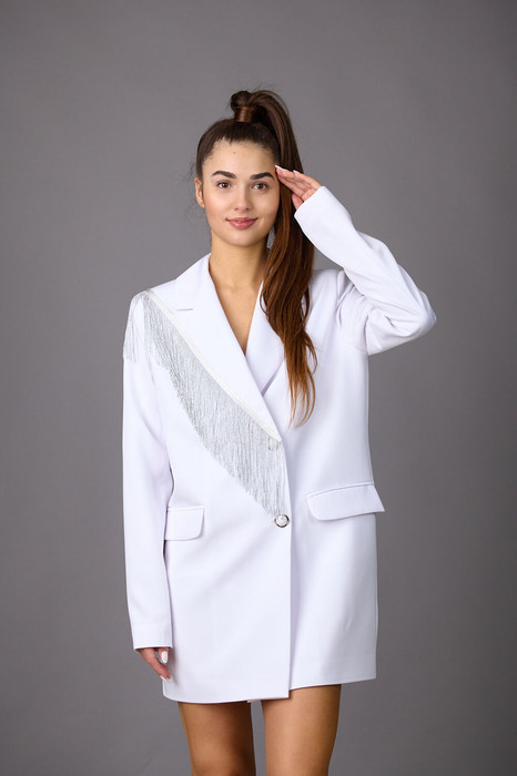 Представляем жакет женский из костюмной ткани на подкладке, который станет  незаменимым спутником в вашей жизни. Лаконичный прямой силуэт жакета с двубортной застежкой прекрасно сочетается с бахромой по лацкану, переходящей на плечо и спинку. По переду- прорезные карманы с клапанами.  Воротник-с отложными лацканами пиджачного типа. Рукава двухшовные, длинные. Жакет можно носить в  сочетании с платьями- комбинациями, юбками, брюками. Позвольте себе быть разной: дерзкой, нежной и невероятно стильной с нашим жакетом!  Длина жакета 44-48р - 82см , 50-54р- 84см