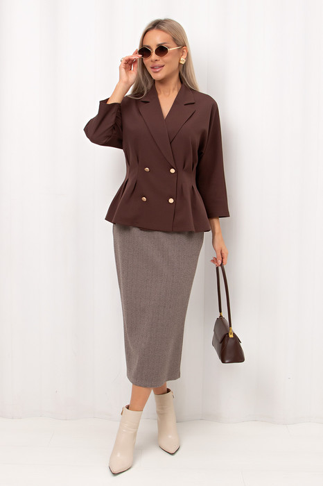 Комфортный жакет приталенного силуэта выполнен из легкой костюмной ткани. Цельнокроенный рукав длиной 7/8. Английский отложной воротник. Двубортная застежка на петли и пуговицы. По линии талии застрочены складки. Низ ровный, без разрезов.