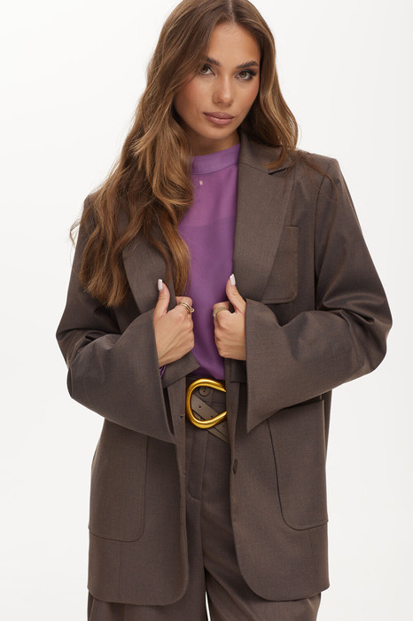 Жакет прямого силуэта из костюмной ткани. Застежка на петли и пуговицы. Воротник пиджачного типа. На переде накладные карманы. По спинке шлица. Рукав прямой двухшовный с высоким разрезом. Жакет на подкладке.
