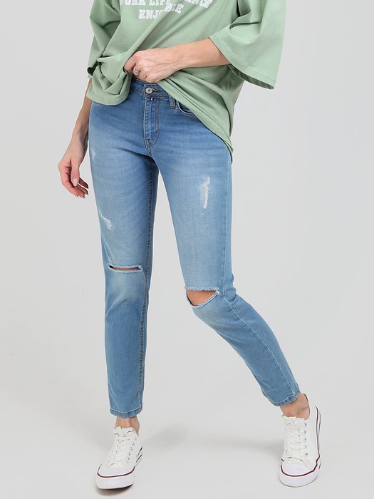 Женские модные джинсы с пятью карманами. Посадка Boyfriend fit. Для улучшения посадки по талии сделан подкройной пояс из 2-х частей. Застежка на молнии. Средняя высота талии, узкие внизу, укороченной длины. Выполнены из слабоэластичной ткани denim comfort stretch. Классическая светлая стирка с потертостями и "усами"спереди и потертостями сзади. На передних половинках джинсов в области колен сделаны дырки, а также в нескольких местах локальные повреждения ткани ("damages"). Параметры указаны для размера 28.