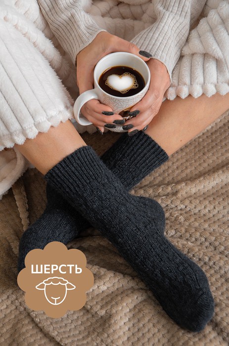 Теплые женские носки выполнены из приятной к телу пряжи с добавлением натуральной шерсти. Однотонные высокие носки черного цвета идеальны для уютных осенних вечеров в компании пледа и какао.