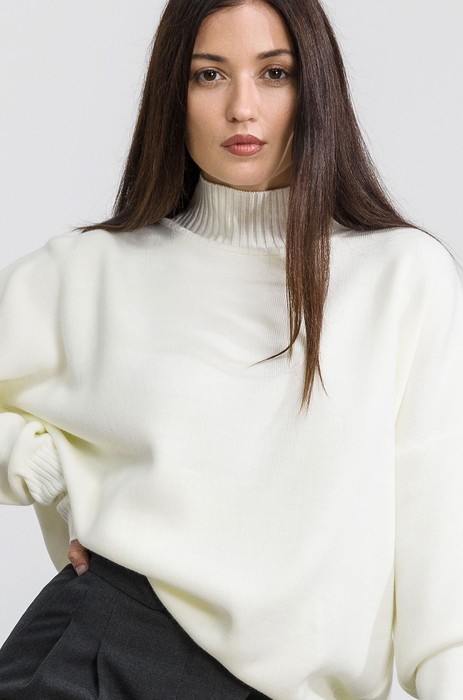 Женский белый свитер с воротником-стойкой выполнен из вязаного трикотажа с добавлением натуральной шерсти и хлопка, что позволяет ему быть очень уютным, мягким и приятным к телу. Джемпер с высоким воротом и удлиненной спинкой позволит сохранить тепло морозной зимой.