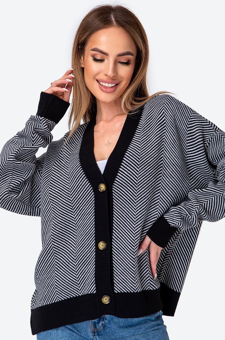 Черно-белый кардиган подойдет для любого случая! Модель кроя оверсайз защитит от прохладного ветра. Свободный силуэт позволяет дополнительно надеть что-то под джемпер.