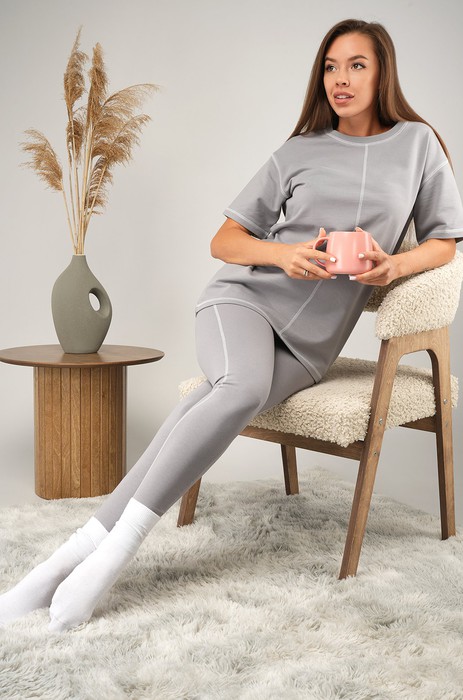Футболка с круглым вырезом и спущенным плечом создаёт расслабленный силуэт, а лосины подчёркивают фигуру и добавляют динамики образу. Трикотажный костюм для женщин — универсальный выбор: он отлично подойдёт для спортивных занятий в зале и станет удобным домашним комплектом на каждый день.