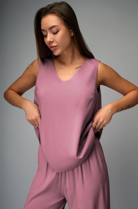 Блузка-топ без рукавов выполнена в свободном крое трапеция с V-образным вырезом, добавляя образу нежности и грациозности. Брюки широкие и расклешенные от бедра, что подчеркивает элегантность и добавляет свободы движения в каждый шаг. Пояс на резинке и карманы дарят удобство, создавая целостный гармоничный образ.