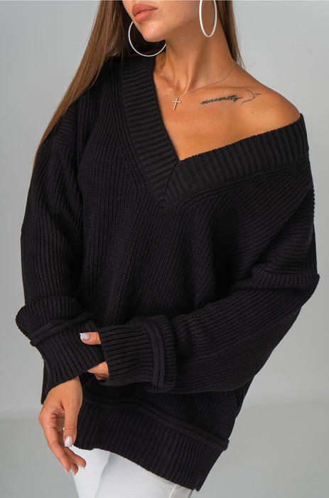 Женский джемпер в черном цвете станет идеальным выбором для создания классного образа. Оверсайз фасон и V-образный вырез добавят легкости и элегантности, а длинный рукав гарантирует комфорт в прохладную погоду.