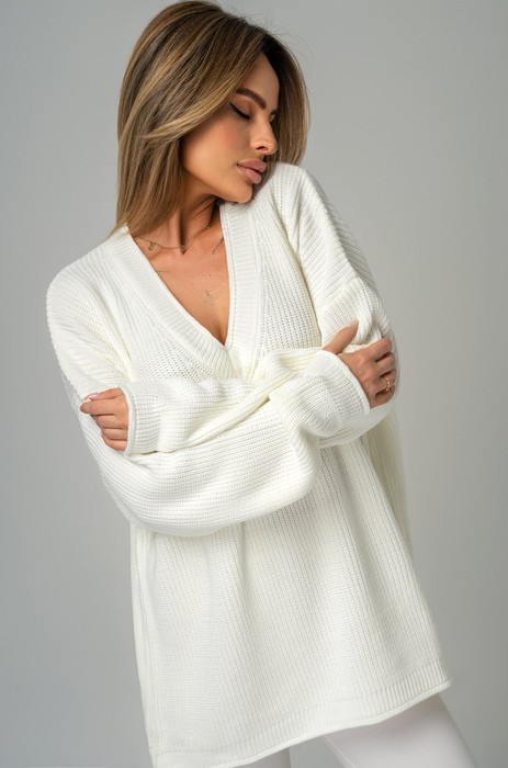 Окутывающий нежностью и заботой белый свитер выполнен из акрила и шерсти. Удлиненный силуэт, крой oversize, v-образный вырез, длинные рукава – в этом джемпере для женщин есть все, что поможет оставаться стильной в любой ситуации!