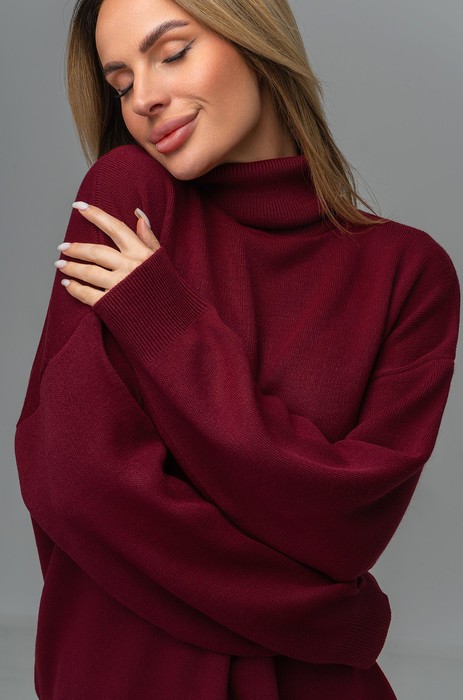 Удлиненный свитер оттенка бургунди выполнен из вязаного трикотажа с добавлением натуральной шерсти и хлопка, что позволяет ему быть очень уютным, мягким и приятным к телу. Женский джемпер с высоким воротом позволит сохранить тепло морозной зимой.