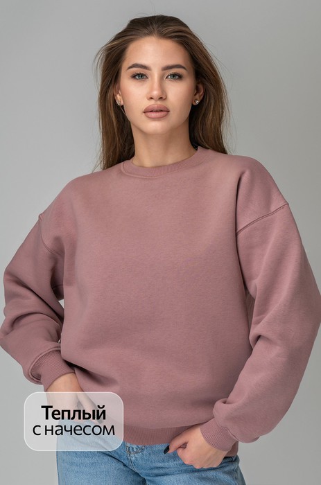 Теплая женская толстовка с начесом представлена в пепельно-розовом цвете. Свободная посадка и спущенная линия плеча придают ощущение расслабленности. Длинные рукава с манжетами и эластичный пояс дарят плотное прилегание.