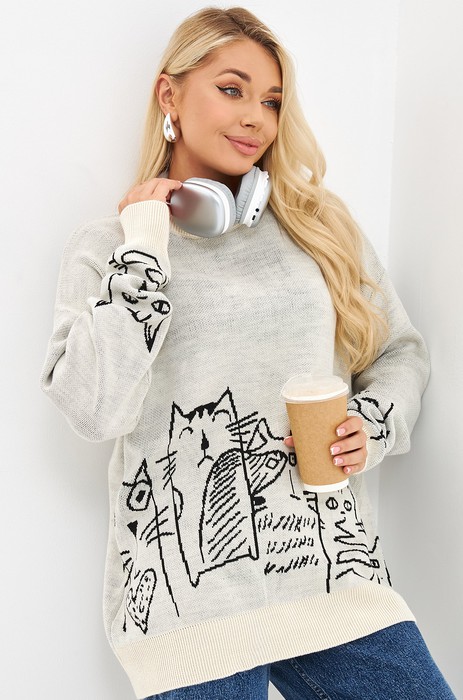 Свободный крой, длинные рукава и спущенное плечо придают джемперу расслабленный вид, а забавный рисунок котики добавляют ему уникальности.