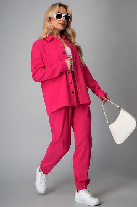 Женский брючный костюм оттенка фуксия объединяет в себе утонченность и практичность. В комплекте рубашка оверсайз (oversize) с акцентными большими карманами и металлическими кнопками, а также брюки джоггеры. Однотонный вельветовый костюм двойка для женщин идеален для весны, осени и прохладной погоды летом.