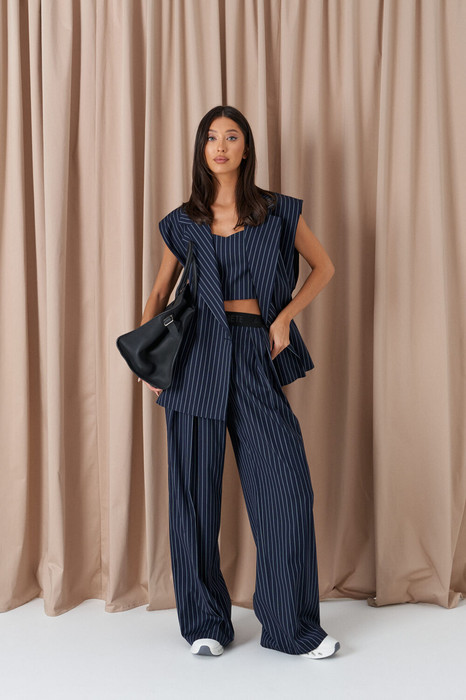 Жилет прямого свободного кроя. Выполнен из костюмной ткани синего цвета с полоской голубого цвета. С подкладкой. Воротник отложной с лацканами. Широкая пройма. По переду справа карман с клапаном. Застёжка центральная пуговицы. Длина спинки 68,5 смЖилет дополнят брюки А1614