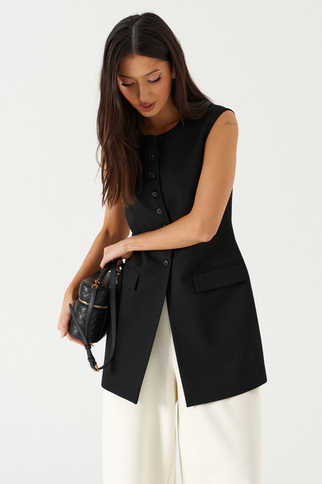 Жилет приталенного кроя выполнен из костюмной ткани черного цвета.Характеристики: приталенный, овальная горловины, подкладка, застежка центральная на петли-пуговицы, без рукавов, по переду прорезные функциональные карманы.