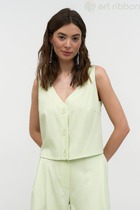 Жилет полуприлегающего силуэта, без подкладки выполнен из струящейся костюмной ткани средней плотности.  По переду -  нагрудные вытачки.