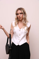Жилет женский прямого силуэта. Перед с отрезным бочком и талиевыми вытачками. По переду обработаны прорезные карманы с клапаном. Спинка со средним швом и рельефами от проймы. Горловина с воротником пиджачного типа и отложным лацканом. Застежка однобортная на петли-пуговицы. Жилет на подкладке. Длина по спинке 85 см